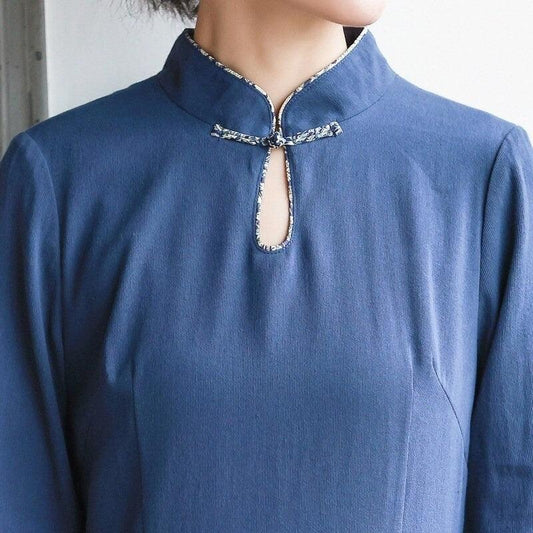 Cotton Dark Blue Cheongsam Top Chinese Qipao