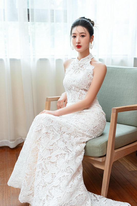 Customizable White Lace Wedding Dress Halterneck Maxi Qipao Small Train Mermaid Wedding Dress