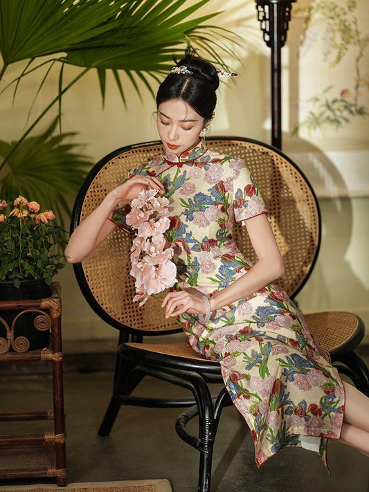 Flower Pattern Long Cheongsam Modern Chinese Qipao