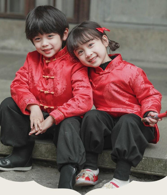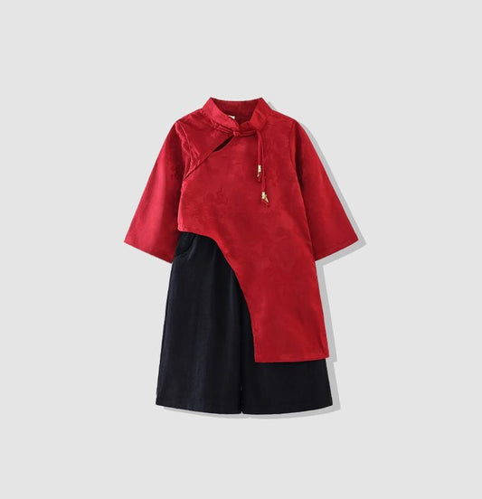 Girl/ Boy Kids long-sleeve Shirt Children's Chinese New year cheongsam outfit Traditional pattern Red Clothes for Kids Shirt and Pants