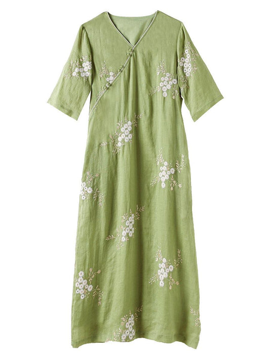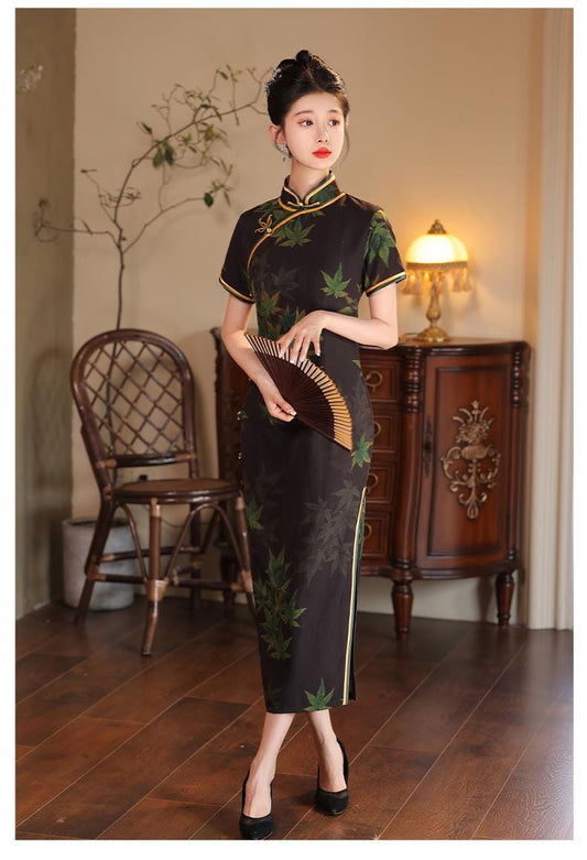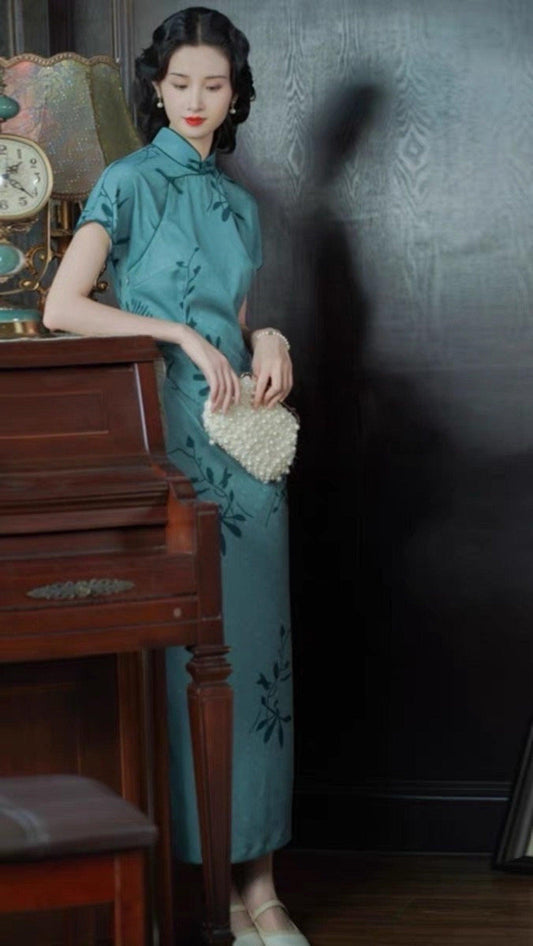 Green Modern Mulberry Silk Short-sleeved long Cheongsam Qipao