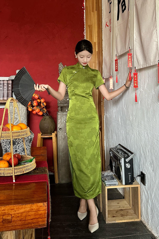 Green Jacquard Silk-like Double-Breasted Long Cheongsam Modern Chinese Qipao