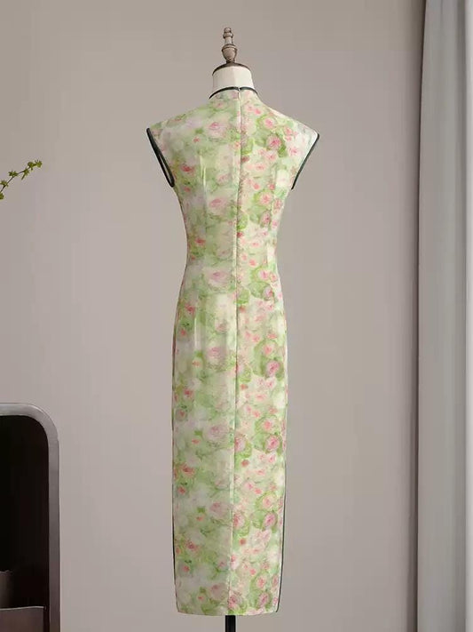 Green Sleeveless Cheongsam, Summer Chinese Qipao, Floral Pattern Daily Wear Dress