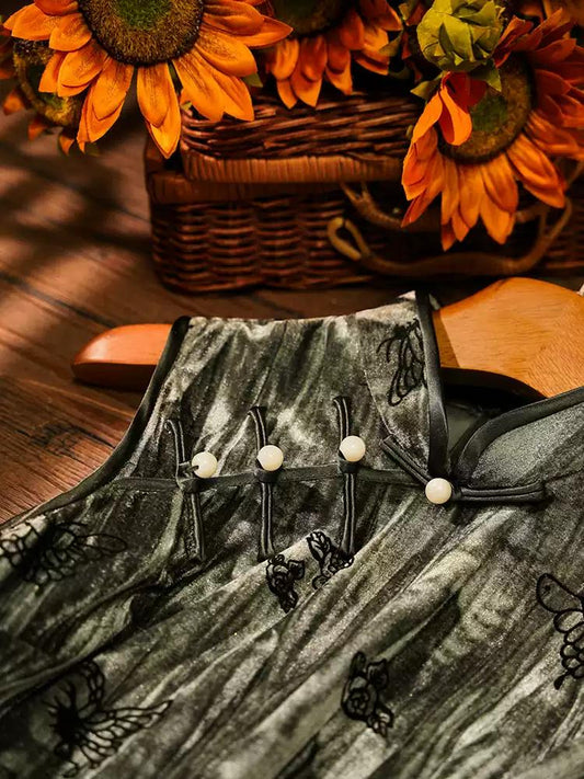 Mulberry Silk Short-sleeved long Cheongsam Dark Green Qipao Traditional Dress Flower Button