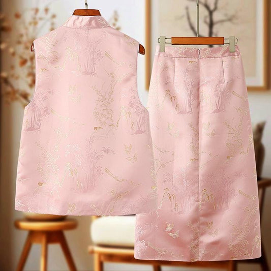 New Chinese Style Autumn/Winter Embroidered Vintage Vest + Half Skirt Artsy Set, Pink Chinese Qipao Set Cheongsam Top Frog Button Blouse