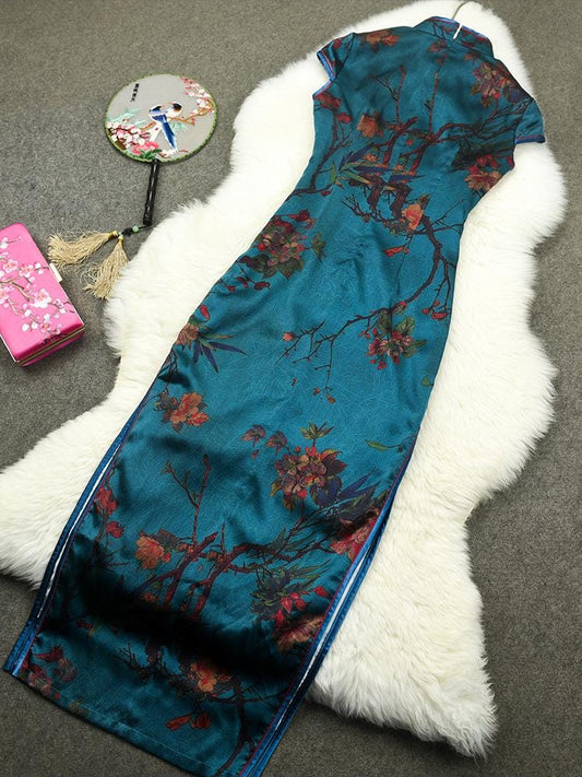 Mulberry Silk Short-sleeved long length Cheongsam Qipao Traditional Dress