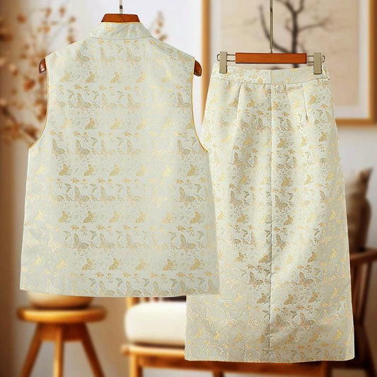New Chinese Style Autumn/Winter Embroidered Vintage Vest + Half Skirt Artsy Set, Chinese Qipao Set Cheongsam Top Frog Button Blouse
