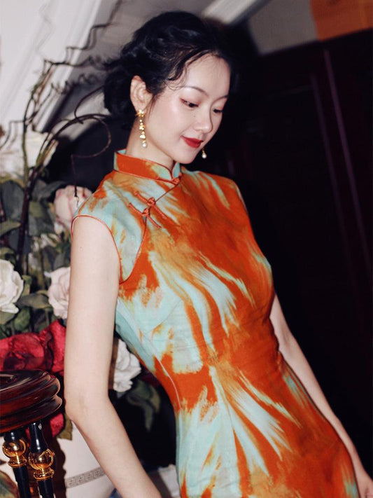 Orange Tie-Dye Inspired Printed Fashion Qipao