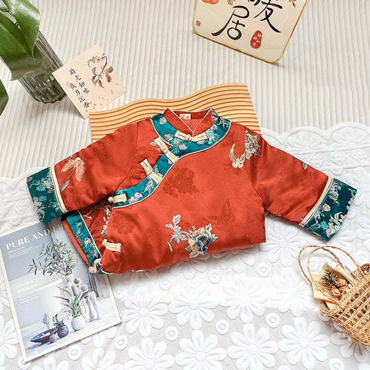 Three-quarter sleeve Velvet Butterfly Pattern Pleated Qipao, Daily cheongsam, Frog Buttons Elegant dress with Mandarin collar Prom Dress