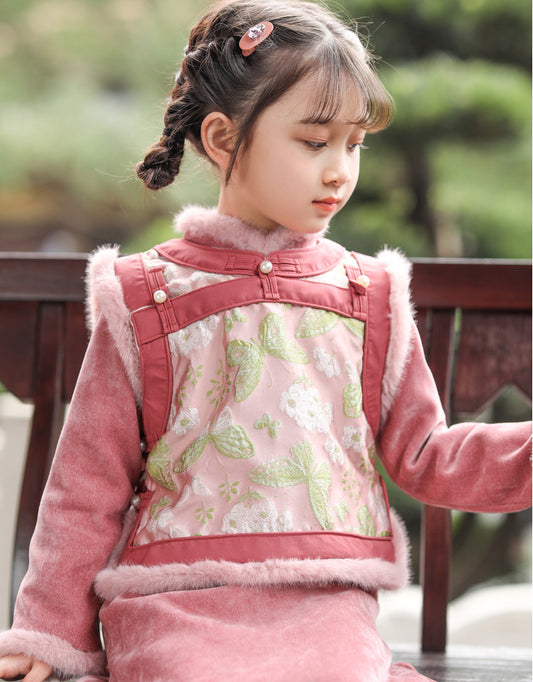 Two-Piece Qipao Set Vest With Orange Red/Mustard Green Cheongsam