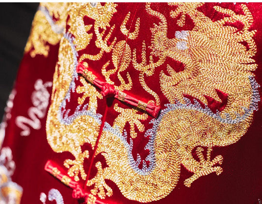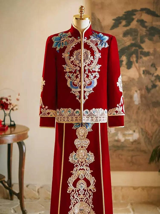 Traditional Chinese Groom Suit Red Wedding Xiuhe Velvet Tea Ceremony