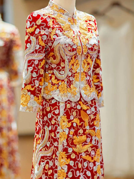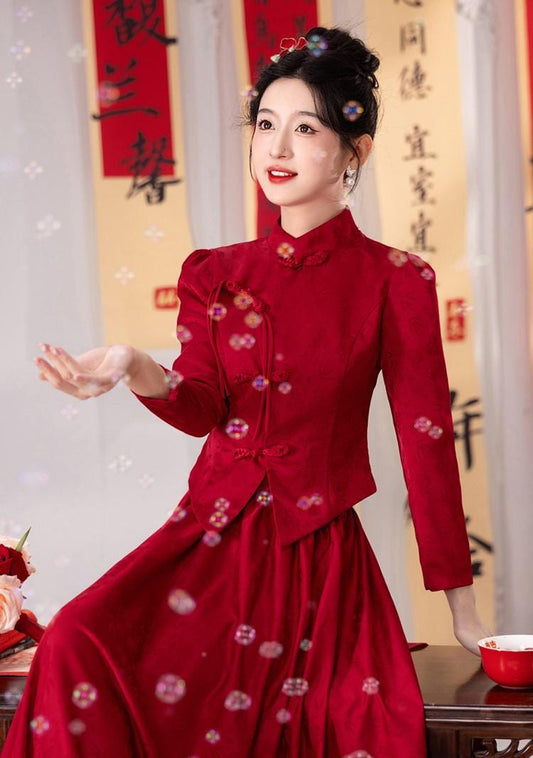 Two piece set Red Traditional Chinese Wedding Dress Cheongsam Qipao Dress