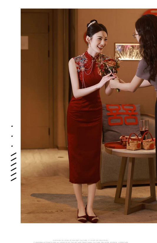 Wine Red Cheongsam Embroidered