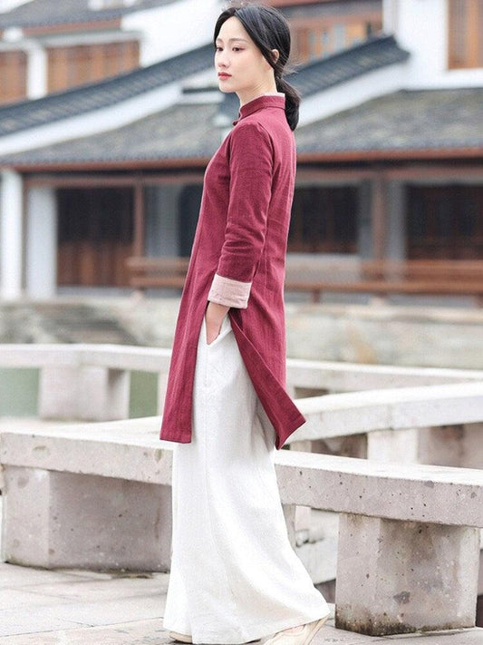 Wine Red Linen Cotton Cheongsam