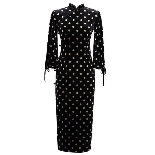 Velvet Polka Dot Qipao with Big Sleeves Hong Kong Style Daily Wear