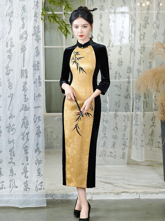 Yellow with Black Fall Chinese Qipao Dress Cheongsam