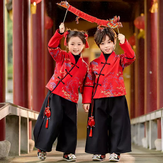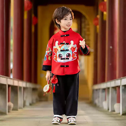 Chinese Style Embroidered Woolen Long Tang Jacket in Burgundy