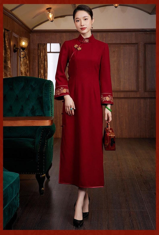 Chinese Style Embroidered Woolen Long Qipao in Burgundy