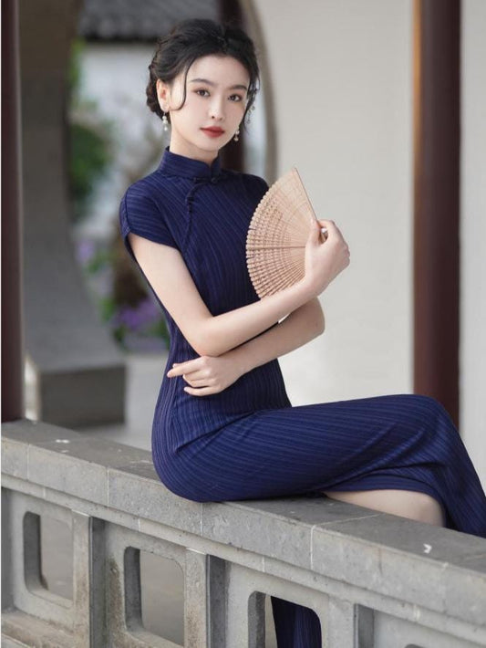 Chinese Modern Cheongsam, Navy traditional Qipao, Long Length Daily Wear