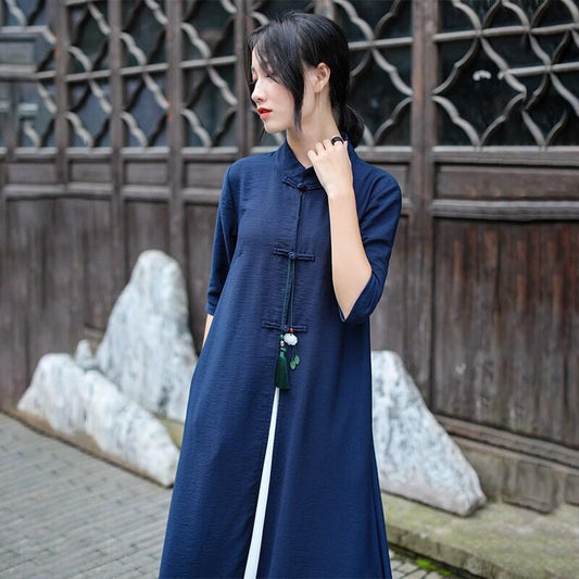 Viscose Cheongsam Top Navy Long Shirt