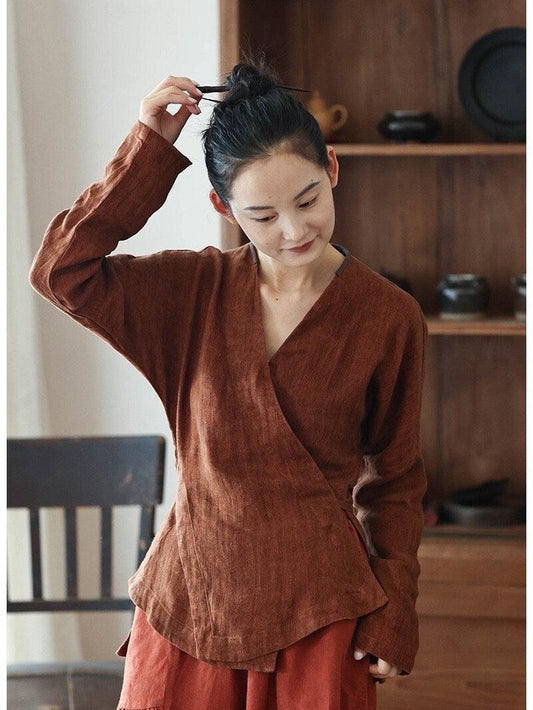 Rust Red Linen Hafu Blouse Blue Linen Shirt