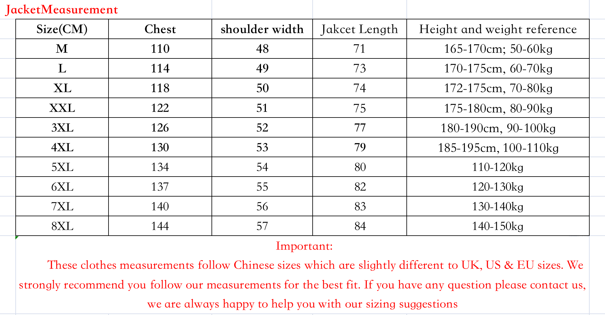 Please note that our size chart is based on the measurements of the clothes, not your body. For men's clothes, We recommend that you find one of your suit tops to measure. Or choose the size based on height and weight.