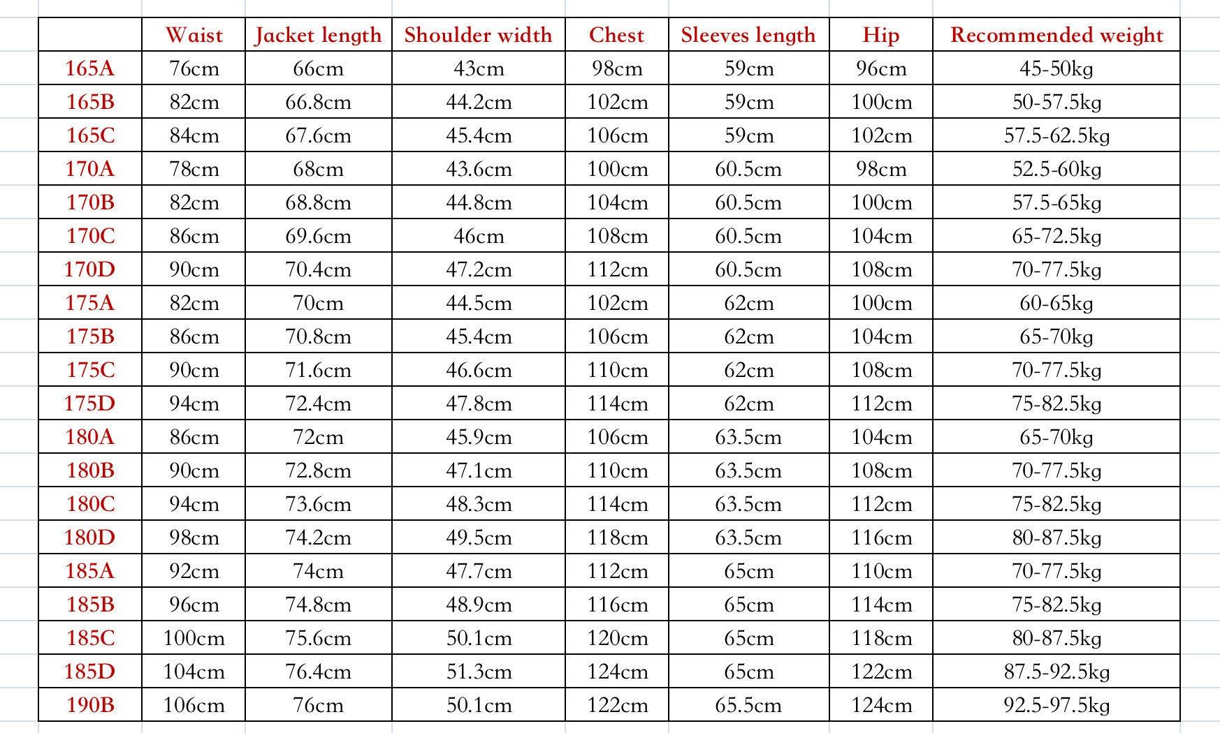 For this suit, the size numbers represent the wearer's height in cm, while the letters A, B, C, D indicate their body build/fullness. refer to the height and weight recommendations to select the most suitable size.